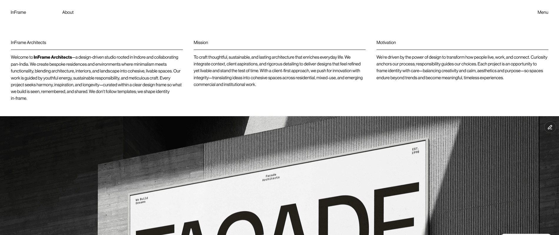 H&H built a custom, business-focused website for Inframe Architects, featuring an immersive portfolio with high-resolution imagery and 3D models. We integrated a "Process" section and a "Meet the Team" page to humanize the brand and build client trust. To drive growth, the site includes smart contact forms for lead qualification and a robust SEO strategy with an "Insights" section to expand organic reach.